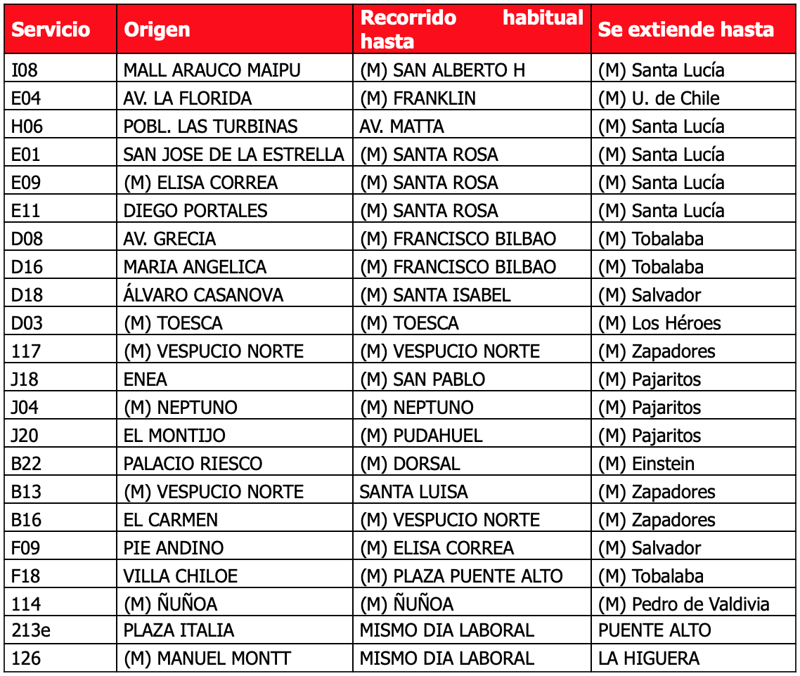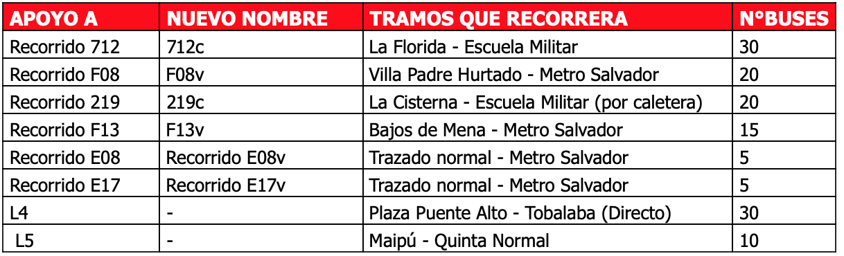 El servicio de buses se reforzó con 135 máquinas para que los usuarios de Puente Alto, La Florida, La Cisterna y Maipú tengan mayores alternativas para llegar a las estaciones de Metro disponibles. Los recorridos son los habituales y, en caso de interrupciones en la vía pública, se implementarán desvíos que se informarán durante el día.