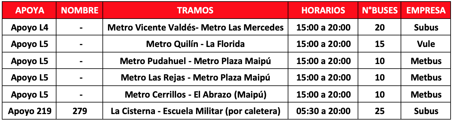 Hay que considerar que estos servicios de apoyo funcionan en forma adicional a los servicios habituales que también ofrecen cobertura a este sector. Se precisa que estos servicios de apoyo serán realizados por buses del sistema, lo que permite además suspender la operación de buses interurbanos.