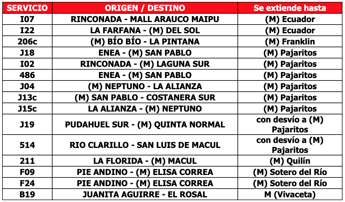 Debido a esto se mantiene para este lunes 02 de diciembre los 102 buses de apoyo a Metro, distribuido en 8 servicios, y las extensiones de recorridos para facilitar el traslado de los usuarios, principalmente en las comunas de Puente Alto, La Florida, La Cisterna y Maipú.
