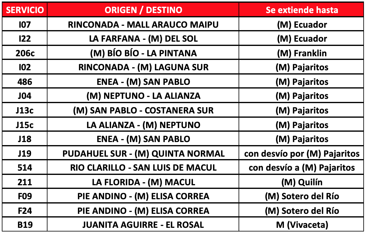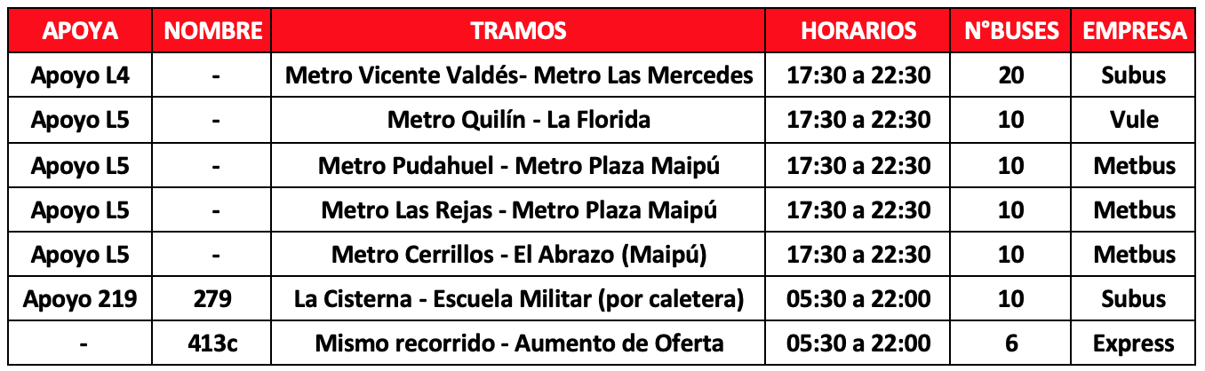A estos se sumaron 82 buses de apoyo que operaron en las estaciones de Metro, distribuidos en 8 servicios, y 15 extensiones de recorridos para facilitar el traslado de los usuarios, principalmente en las comunas de Puente Alto, La Florida, La Cisterna y Maipú.