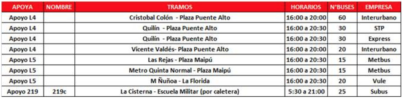 Debido a los anuncios de manifestaciones en el sector de Tobalaba, los buses de apoyo que habitualmente salían desde dicha estación de Metro saldrán esta tarde desde la estación Cristóbal Colón hacia Plaza de Puente Alto.