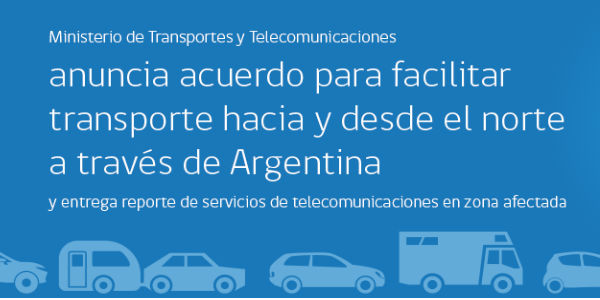 El Ministro de Transportes y Telecomunicaciones, Andrés Gómez-Lobo, informó que con el fin de lograr una conectividad por vía terrestre más expedita para la zona norte del país, se realizaron gestiones ante el Ministerio de Interior y Transporte de Argentina para extender el régimen del ‘Convenio Chileno-Argentino de Transporte Terrestre en tránsito para vincular dos puntos de un mismo país utilizando el territorio de otro’ a las regiones de Coquimbo, Atacama y Antofagasta.