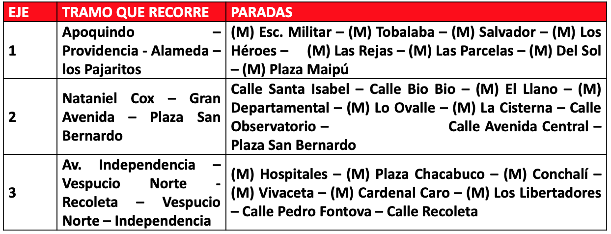 Aquí el detalle de los buses de apoyo, donde se indica a qué recorrido y/o línea de Metro apoyan y el tramo que recorrerá: