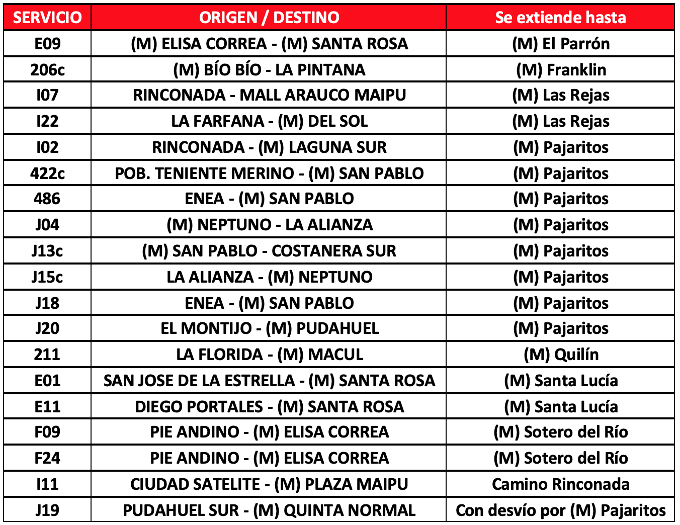 A ellos se suman para esta tarde, 19 extensiones de servicios habituales hacia estaciones de Metro:
