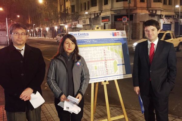 El Subsecretario de Transportes Cristián Bowen, junto al Director de Transporte Público Metropolitano, Guillermo Muñoz y la Jefa del Programa de Fiscalización, Paula Flores, realizaron una inspección al funcionamiento de calle San Antonio en Santiago Centro, que desde hace una semana se convirtió en una vía exclusiva en horario extendido, de lunes a viernes. Esto, en el marco del Plan Centro que se implementa actualmente en la comuna de Santiago.