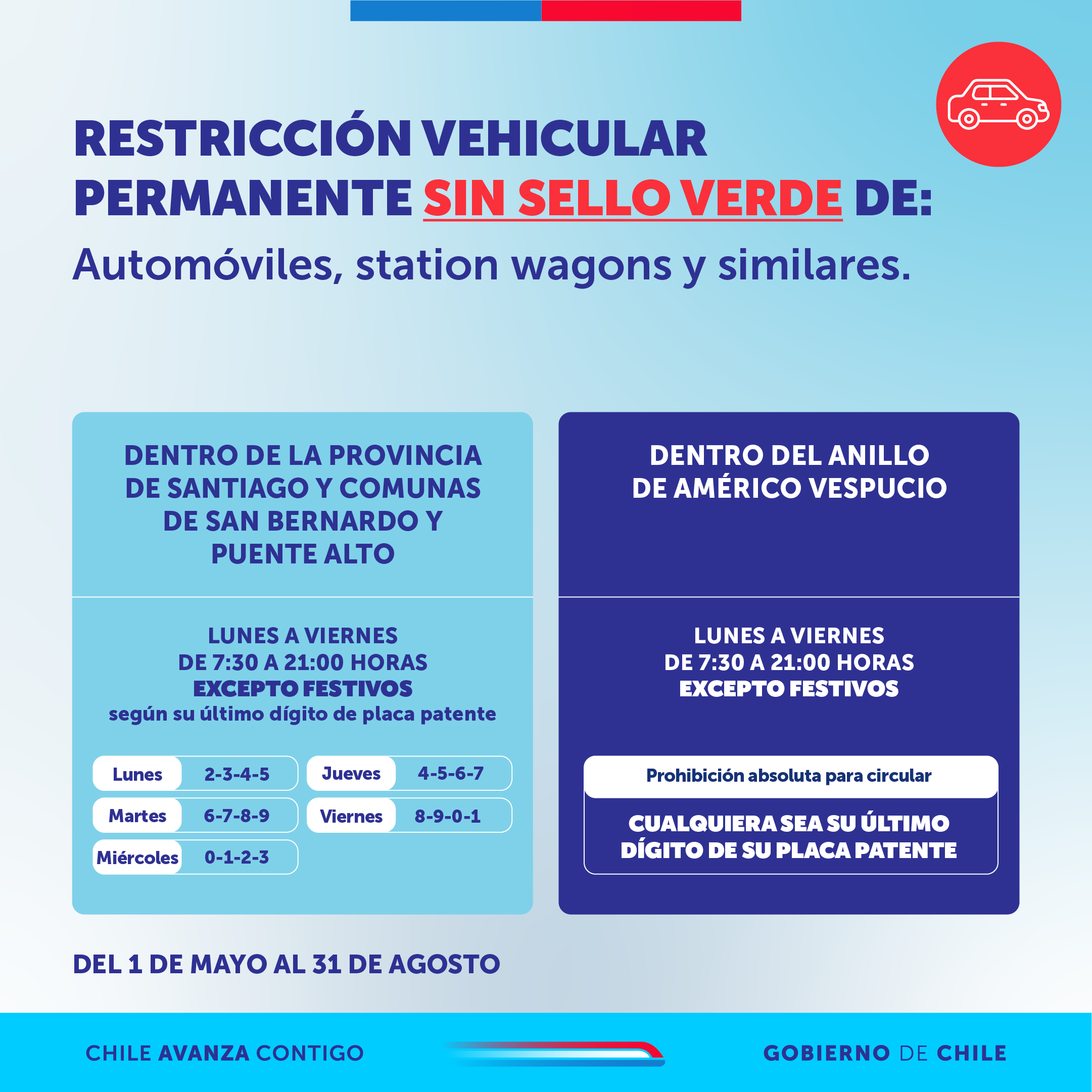 La medida establece que en el caso de los vehículos catalíticos con sello verde inscritos antes del 1 de septiembre de 2011, se aplicará restricción vehicular de dos dígitos diarios en la provincia de Santiago y en las comunas de Puente Alto y San Bernardo. Lo mismo para las motos inscritas antes de 2010.