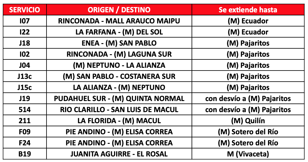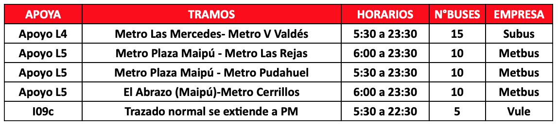 Respecto a los buses de apoyo, se contará con 50 buses adicionales para reforzar la operación que se distribuirán en 5 servicios que permitirán a los usuarios de las comunas de Puente Alto, Maipú, Pudahuel, La Cisterna y La Florida, tener una alternativa de transporte en los tramos en que no está funcionado Metro. En caso de requerir más apoyos por aumento de aglomeraciones se activarán más servicios de buses.