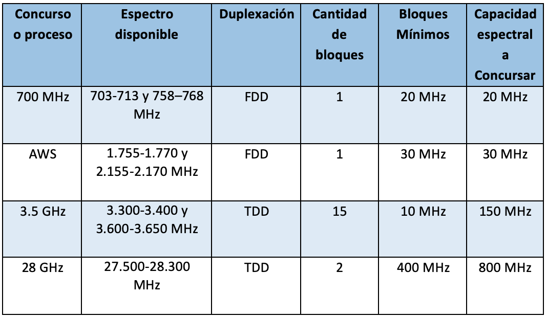 Las redes inalámbricas 5G se han transformado en la última tendencia para el mercado tecnológico de las telecomunicaciones debido a su baja latencia, alta velocidad y mayor eficiencia en el consumo de energía en comparación con otras tecnologías preexistentes. De esta manera, tales atributos han motivado a que diversos países comiencen un proceso de asignación de bandas de espectro radioeléctrico para la implementación de redes de comunicación de alta velocidad, las cuales sean capaces de fomentar la innovación en los mercados, mejorar el rendimiento de la economía digital y profundizar la calidad de vida de los ciudadanos.