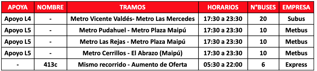 A estos se sumaron con 64 buses de apoyo a Metro, distribuido en 7 servicios, y 15 extensiones de recorridos para facilitar el traslado de los usuarios, principalmente en las comunas de Puente Alto, La Florida, Pudahuel, La Cisterna y Maipú.