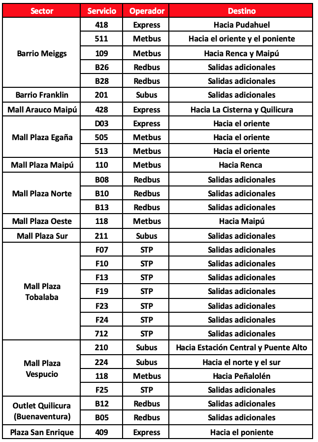 Se trata de 30 servicios, en 12 zonas comerciales del Gran Santiago que apoyarán, entre las 21:00 y las 23:00, a quienes hagan sus compras en los principales malls, outlet y barrios comerciales de Santiago.