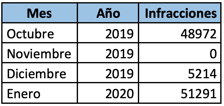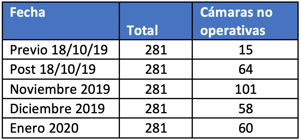 En total, de las 281 cámaras que hay para esta labor en los 333 kilómetros de extensión que tiene estas vías prioritarias, en octubre se cursaron 48.972 multas. Sin embargo, luego del 18 de octubre y debido a la destrucción de las cámaras de control, entre noviembre y diciembre se cursaron 5.214 multas. Sin embargo, gracias al trabajo de recuperación de cámaras, en enero de 2020 se cursaron 51.291 infracciones, un nivel levemente mayor al de octubre pasado.