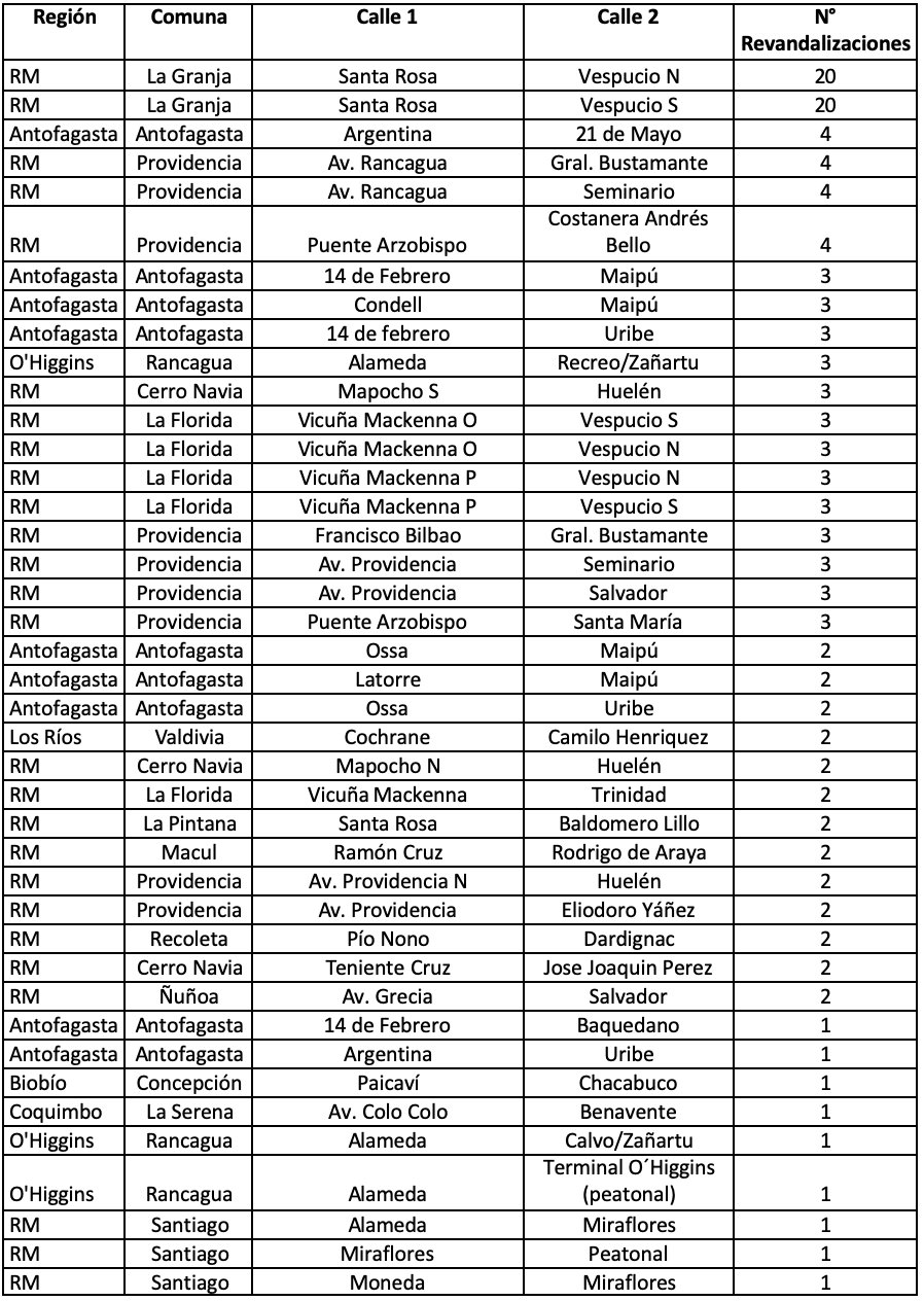 De acuerdo a las cifras, 28 de las 41 intersecciones revandalizadas se encuentran en las llamadas “zona cero” de las regiones Metropolitana, Antofagasta, O’Higgins y Los Ríos.