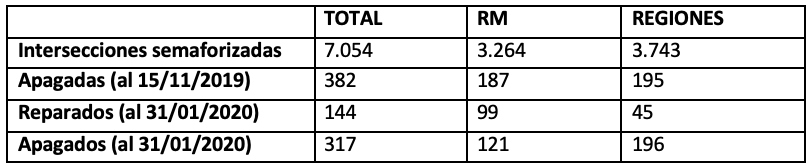 El Ministro (s) Domínguez añadió que, de las 7.054 intersecciones semaforizadas que existen en el país, 317 están apagadas, de las cuales, 121 están en la Región Metropolitana.