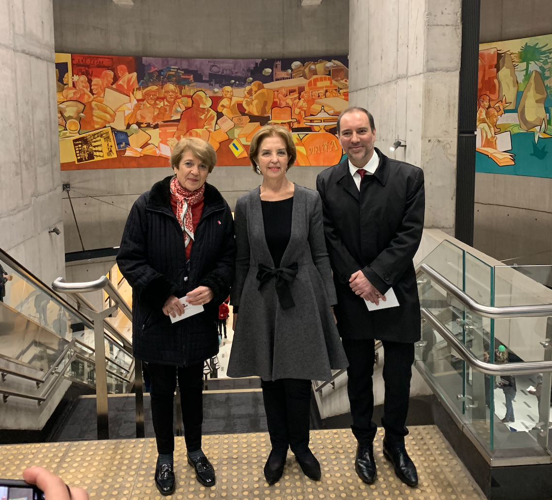 La Ministra de Transportes y Telecomunicaciones, Gloria Hutt; la Ministra de las Culturas, las Artes y el Patrimonio, Consuelo Valdés; el Presidente del Directorio de Metro, Louis de Grange; y el Rector de la Universidad Central, Santiago González Larraín, participaron esta mañana de la inauguración del nuevo mural de la estación Parque Almagro de Línea 3 de Metro.