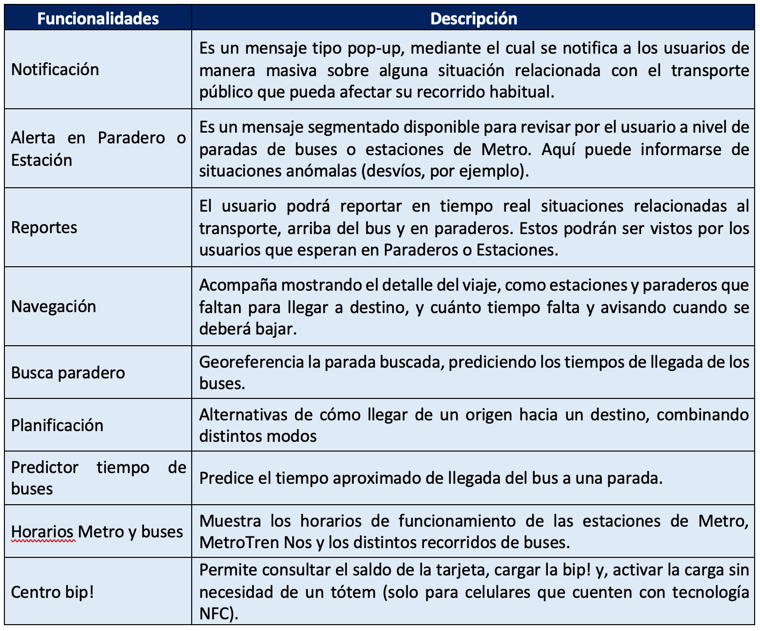 “Quienes la descarguen podrán, por ejemplo, informarse sobre eventuales problemas de infraestructura, como paraderos en mal estado o buses con problemas. La aplicación también establece un sistema de alertas posibilitando que los usuarios que esperan en un paradero de bus, una estación de Metro, reciban alertas georreferenciadas, indicando situaciones excepcionales que les afecten como desvíos de buses, interrupciones en la red de Metro o afectación de servicios por situaciones externas”, agregó la Secretaria de Estado.