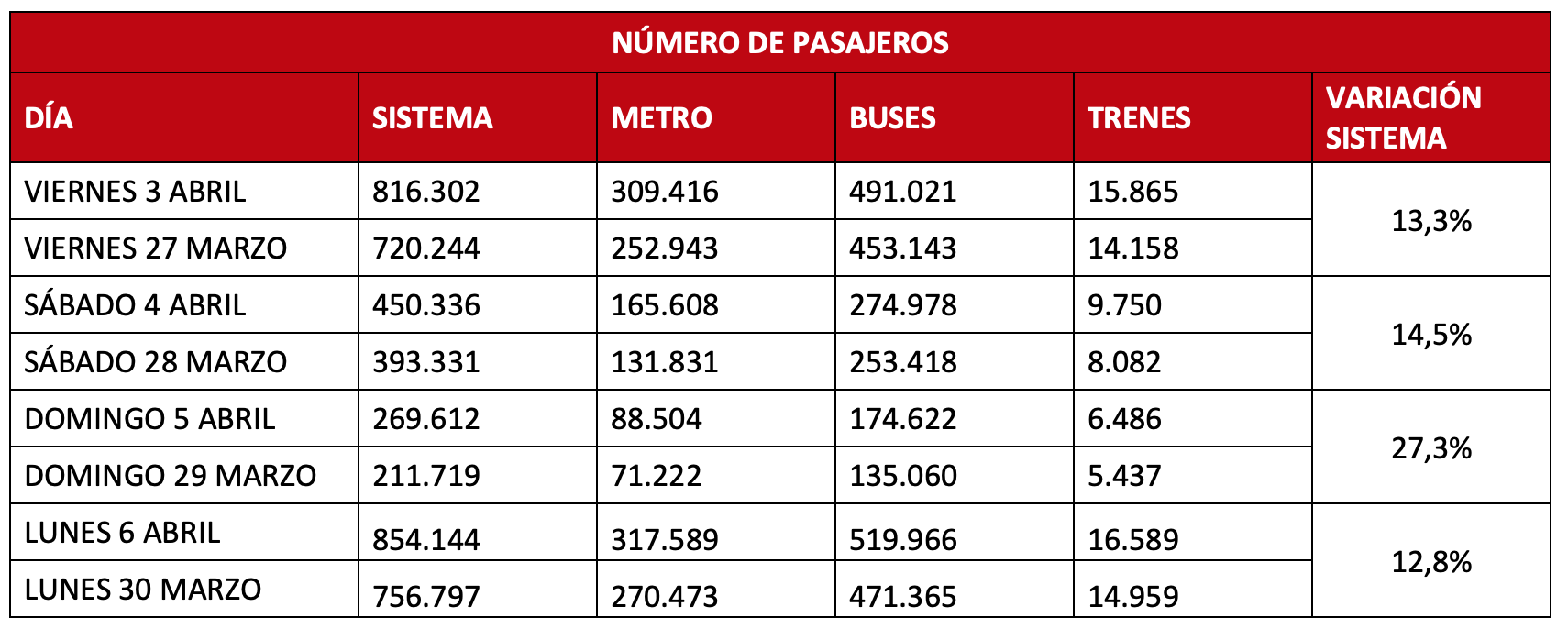Esto se suma a la información de los buses del Transporte Público Metropolitano. Si el viernes 27 de marzo hubo un flujo de 453.143 pasajeros, el del viernes 3 de abril fue de 491.021, representando un incremento de un 8,3%. En Metro el aumento fue mayor y las transacciones pasaron de 252.943 a 309.416, significando un 22,3% más.