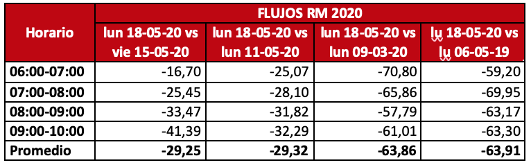 Así, la baja del flujo vehicular en la Región Metropolitana fue de un 29% con respecto al lunes y viernes pasado, y de un 63% en relación a mayo del año pasado.