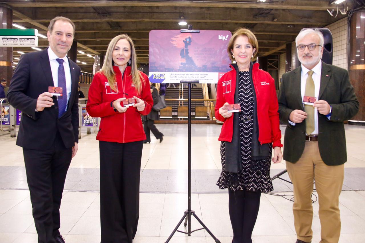 Las ministras Gloria Hutt, de Transportes y Telecomunicaciones e Isabel Plá, de la Mujer y Equidad de Género, junto a Louis de Grange, Presidente del Directorio de Metro de Santiago, presentaron hoy la nueva tarjeta bip! inspirada en la Igualdad de Género, uno de los 17 Objetivos de Desarrollo Sostenible (ODS) promovidos por las Naciones Unidas.