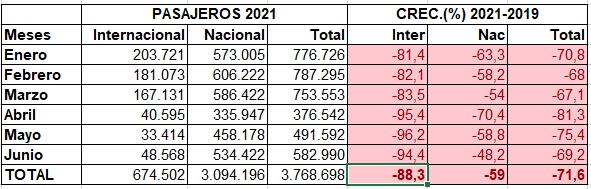La Junta de Aeronáutica Civil del MTT, entregó el reporte de tráfico aéreo correspondiente al primer semestre de 2021, periodo en el cual se transportaron 3.775.862 pasajeros, de los cuales 3.100.341 lo hicieron con origen o destino nacional y 674.502 internacional. Al comparar las cifras con el mismo periodo de 2019 –considerado como un “año normal”- se registra una caída total de 71,6%: -59% en vuelos nacionales y -88,3% en los internacionales.