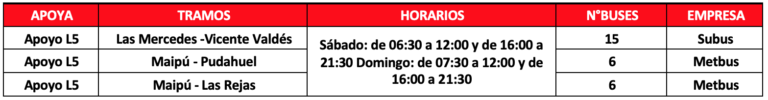 Respecto a los buses de apoyo, habrá 27 buses adicionales para reforzar la operación que se distribuirán en 3 servicios que permitirán a los usuarios de las comunas de Puente Alto, Pudahuel y Maipú tener más alternativas de transporte en los tramos en que aún no está funcionado Metro. En caso de requerir más apoyos por aumento de aglomeraciones se activarán más servicios de buses.