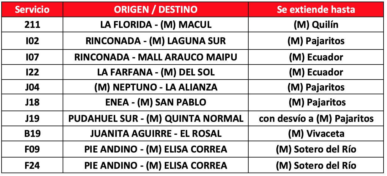 Se contará con 27 buses de apoyo a Metro distribuidos en 3 servicios y 10 extensiones de servicios, todo esto para facilitar el traslado de los usuarios principalmente en las comunas de Puente Alto, Pudahuel y Maipú.