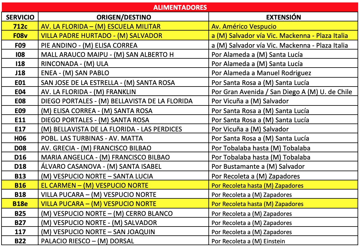 Habrá 197 buses de apoyo, especialmente a los tramos Tramo Plaza Puente Alto – Tobalaba, Plaza Puente Alto – Baquedano, Plaza Puente Alto – Salvador, Plaza Puente Alto – Escuela Militar y Maipú – Quinta Normal.