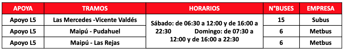 Respecto a los buses de apoyo, habrá 27 buses adicionales para reforzar la operación que se distribuirán en 3 servicios que permitirán a los usuarios de las comunas de Puente Alto, Pudahuel y Maipú tener más alternativas de transporte en los tramos en que aún no está funcionado Metro. En caso de requerir más apoyos por aumento de aglomeraciones se activarán más servicios de buses.