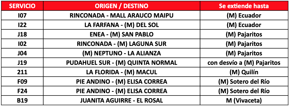 Se contará con 27 buses de apoyo a Metro distribuidos en 3 servicios y 10 extensiones de servicios, todo esto para facilitar el traslado de los usuarios principalmente en las comunas de Puente Alto, Pudahuel y Maipú.