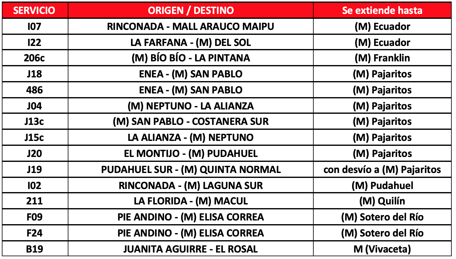Desde de este lunes 25 de noviembre, se contará con 102 buses de apoyo a Metro distribuidos en 8 servicios y 15 extensiones de servicios, todo esto para facilitar el traslado de los usuarios principalmente en las comunas de Puente Alto, La Florida, La Cisterna y Maipú.