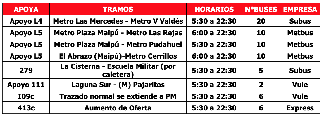 Respecto a los buses de apoyo, se contará con 69 buses adicionales para reforzar la operación que se distribuirán en 8 servicios que permitirán a los usuarios de las comunas de Puente Alto, Maipú, Pudahuel, La Cisterna y La Florida, tener una alternativa de transporte en los tramos en que no está funcionado Metro. En caso de requerir más apoyos por aumento de aglomeraciones se activarán más servicios de buses.
