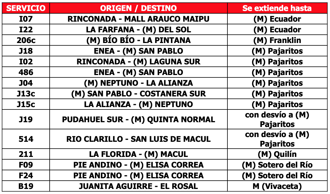 Respecto a los buses de apoyo, se contará con 82 buses adicionales para reforzar la operación que se distribuirán en ocho servicios que permitirán a los usuarios de las comunas de Puente Alto, Maipú, Pudahuel, La Cisterna y La Florida, tener una alternativa de transporte en los tramos en que no está funcionado Metro. En caso de requerir más apoyos por aumento de aglomeraciones se activarán más servicios de buses.