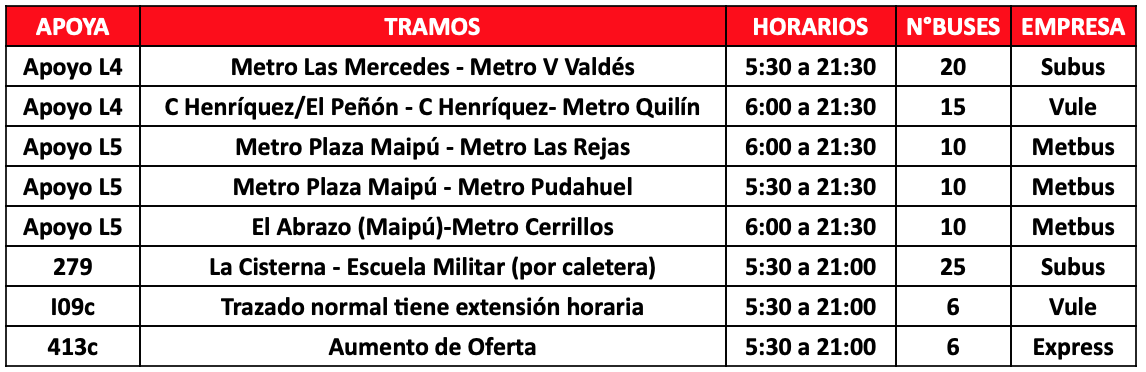 Respecto a los buses de apoyo, se mantienen los 102 buses adicionales para reforzar la operación que se distribuirán en 8 servicios que permitirán a los usuarios de las comunas de Puente Alto, tener una alternativa de transporte en los tramos en que no está funcionado Metro. En caso de requerir más apoyos por aumento de aglomeraciones se activarán más servicios de buses.