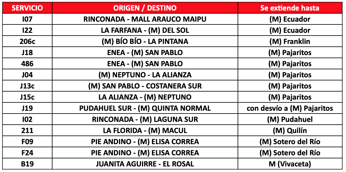 Para este miércoles 27 de noviembre se contará con 102 buses de apoyo a Metro, distribuidos en ocho servicios y 14 extensiones de recorridos, para facilitar el traslado de los usuarios, principalmente en las comunas de Puente Alto, La Florida, La Cisterna y Maipú.