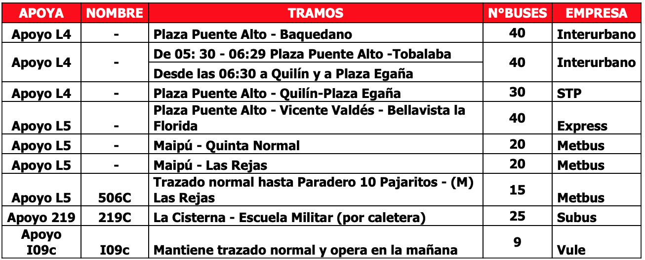 Aquí el detalle de los buses de apoyo, se indica a qué recorrido y/o línea de Metro apoyan y el tramo que recorrerá:
