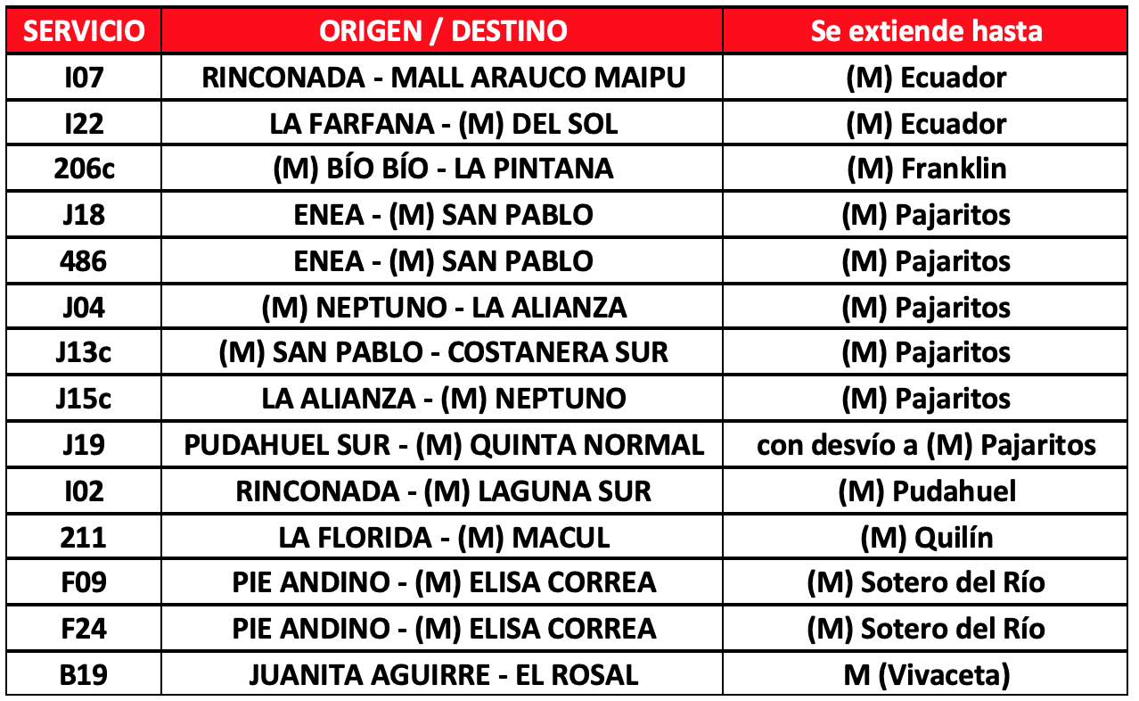 Al igual que en días anteriores, y gracias al compromiso de los dirigentes gremiales y responsables de líneas de taxis colectivos, los servicios se mantendrán de forma habitual, con extensiones hasta el centro de Santiago y hasta estaciones de Metro que se encuentren habilitadas. Esto principalmente en las comunas de Maipú y Puente Alto.