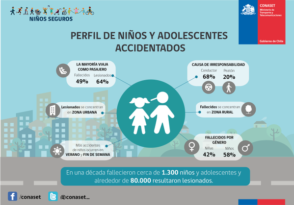 Gómez-Lobo agregó que el 41% de los niños y adolescentes fallecidos y el 27% de los lesionados son peatones, mientras que solamente el 10% de niños y adolescentes fallecidos y el 9% de lesionados fueron conductores (en su mayoría conductores de bicicleta).