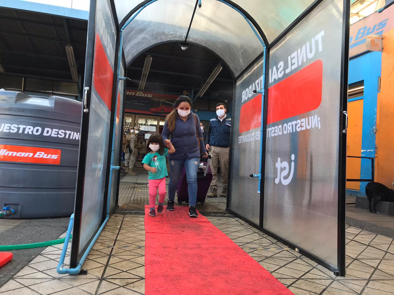 En el Terminal Alameda, la empresa Pullman Bus puso a disposición de los pasajeros el primer módulo sanitizador, que rocía “Innowatech Anolyte”, un desinfectante con ácido hipocloroso, aprobado por la Organización Mundial de la Salud (OMS).