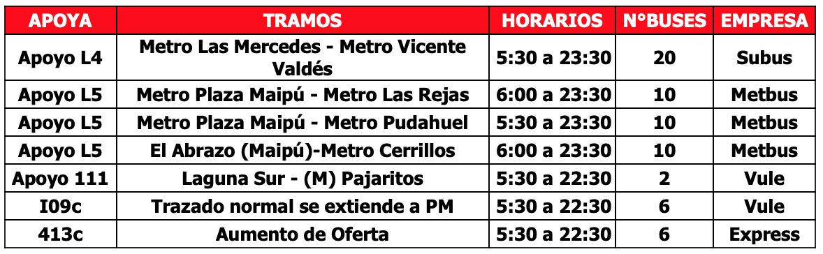 Respecto a los buses de apoyo, se contará con 64 buses adicionales para reforzar la operación que se distribuirán en 7 servicios que permitirán a los usuarios de las comunas de Puente Alto, Maipú, Pudahuel, La Cisterna y La Florida, tener una alternativa de transporte en los tramos en que no está funcionado Metro. En caso de requerir más apoyos por aumento de aglomeraciones se activarán más servicios de buses.
