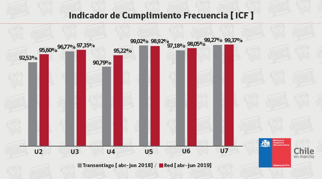 Según las cifras que arroja el informe del segundo trimestre de 2019, todas las empresas operadoras están cumpliendo con el mínimo exigido por el Ministerio de Transportes y Telecomunicaciones, que corresponde a 90% de cumplimento en frecuencia y a 80% de cumplimiento en el indicador de regularidad.