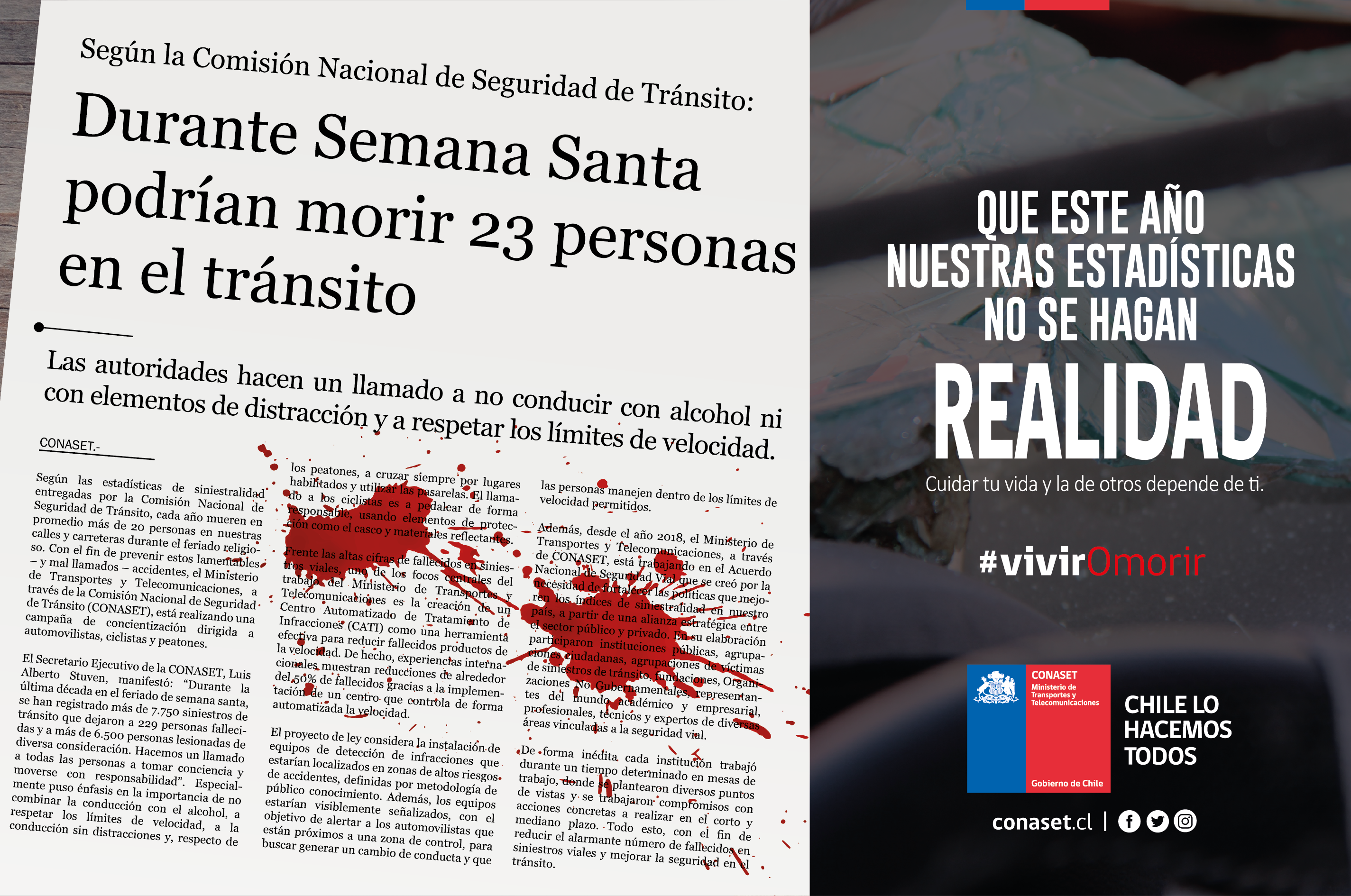 La ministra de Transportes y Telecomunicaciones, Gloria Hutt, junto al Secretario Ejecutivo de la Comisión Nacional de Seguridad de Tránsito (Conaset), Luis Alberto Stuven, Carabineros de Chile y la Mutual de Seguridad, lanzaron la campaña #viviromorir que busca concientizar a conductores, peatones y ciclistas, a través de mensajes que buscan transparentas las estadísticas de fallecidos en el tránsito durante Semana Santa.